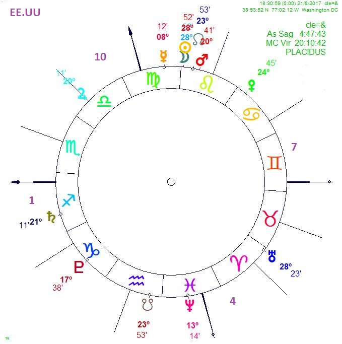 Sobre estas líneas la carta del eclipse para EEUU, como sabes, debemos leerla en su contexto, que es el ingreso del 0º de Aries y las cuartas. Pero para ir entrando en materia es conveniente ver hacia donde nos lleva.