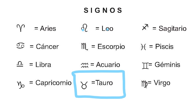 Puedes buscar el símbolo señalado en azul bajo estas líneas en tu carta, y armar una frase tipo:«no me gustan los cambios» o » tiendo a acumular en» + y añades lo que corrospende a la casa de Tauro, pinchando aquí puedes encontrar lo que es cada casa.