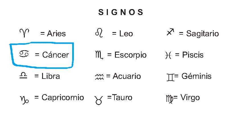 Sobre estas líneas puedes ver el símbolo o lo que los astrólogos llamamos glifo de cáncer marcado en azul.