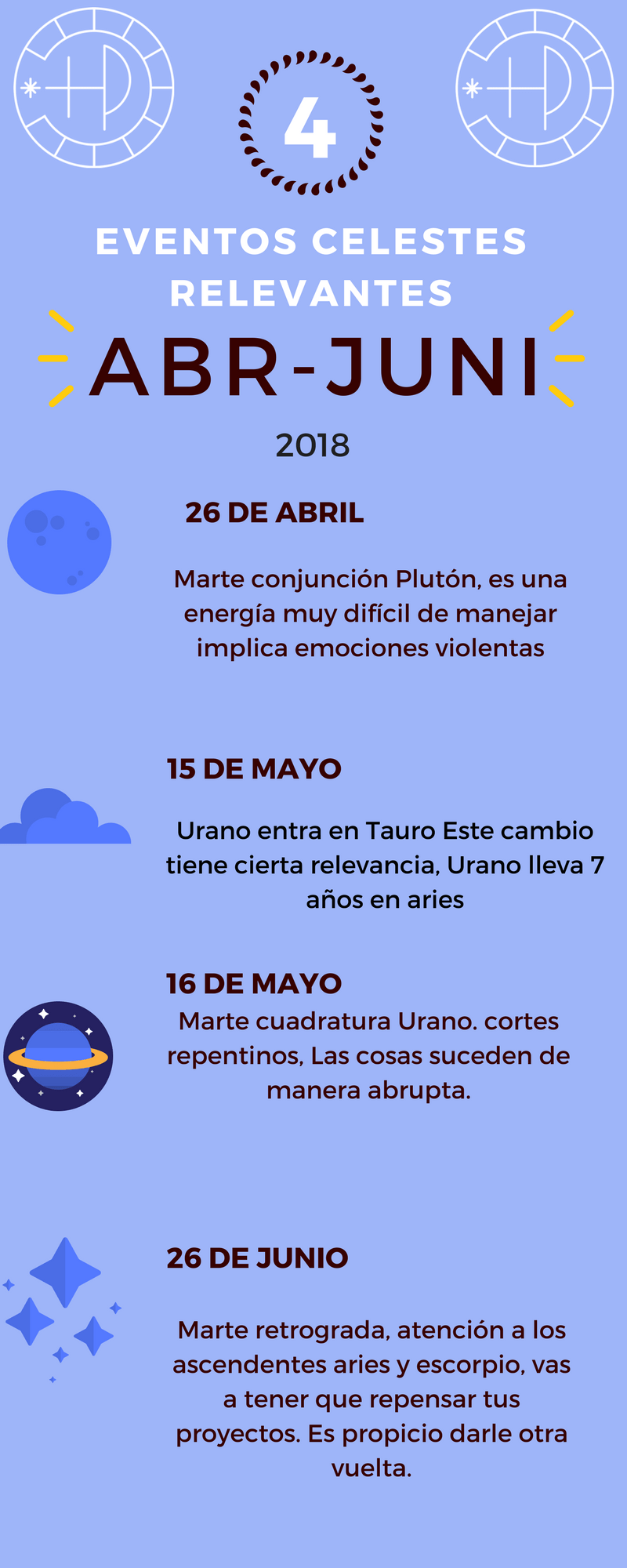 He creado para ti una infografía sobre los 4 momentos astrolológicos relevantes que van a tener lugar de abril a junio de 2018, alguno lo desarrollaré más adelante, pero me parece interesante que puedas tener una idea general de lo que viene en los dos próximos meses.
