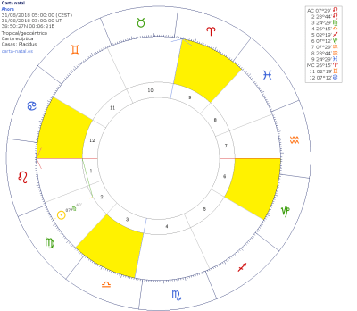 En la carta de la izquierda vemos a Venus, señalada por una flecha rosa, y a Marte, señalado por una flecha roja en cuadratura (la línea roja más gruesa).