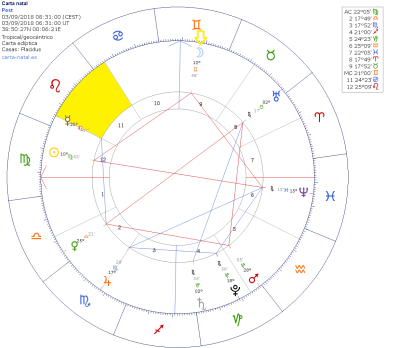 En la carta que ves a la izquierda, la Luna señalada por una flecha amarilla, el la regente de la casa XI, porque la casa XI comienza en cáncer, pintada de amarillo en la carta, bien, como la casa XI es la carta de los amigos, entre otras cosas, esta carta está señalando que ése área, la de los amigos (y amigas) puede verse afectada a lo largo de la vida por mucha variabilidad, idas y venidas, grupos a los que te unes y por algún motivo dejas con el tiempo.