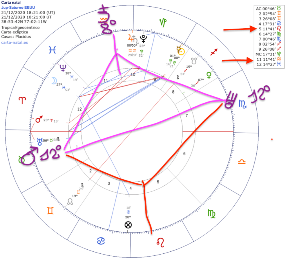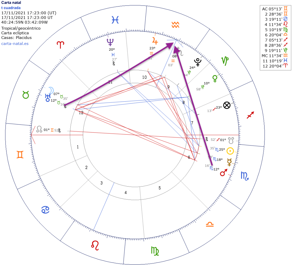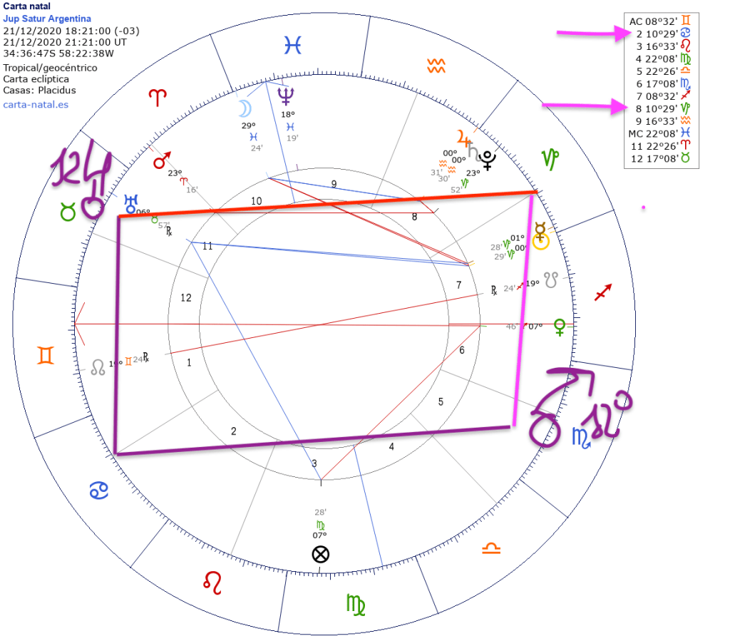 Saturno de la carta de la Tcuadrada cae sobre Júpiter de la toma de posesión, señalado por una flecha fucsia.