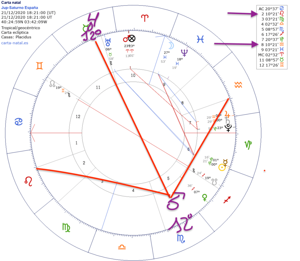 Si ponemos la carta de la T-Cuadrada de noviembre sobre la carta de la conjunción Júpiter-Saturno para España, resulta que también queda la casa VIII, el tesoro, dañado.