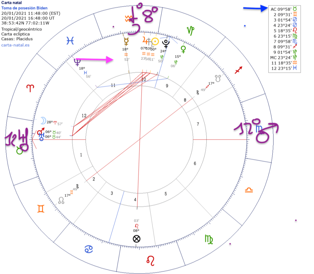 La carta de la toma de posesión de Biden es un polvorín, Urano y Marte conjuntos en XII, muy pegados al ascendente, esto augura problemas porque son dos planetas explosivos juntos y además cuadrados con Saturno, lo que no ayuda nada a generar armonía.