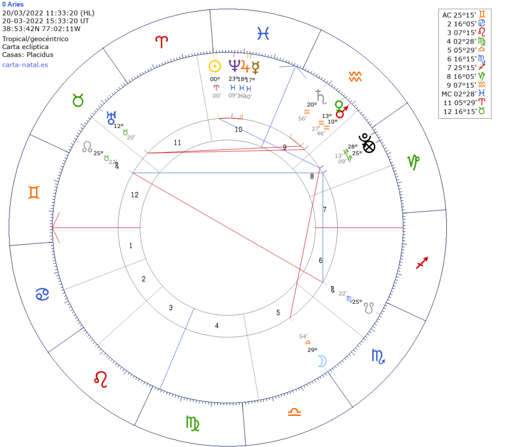 Carta 2, El 0º de Aries de 2022 para España, con Júpiter y Saturno en los mismos grados. Aunque en distintas casas.