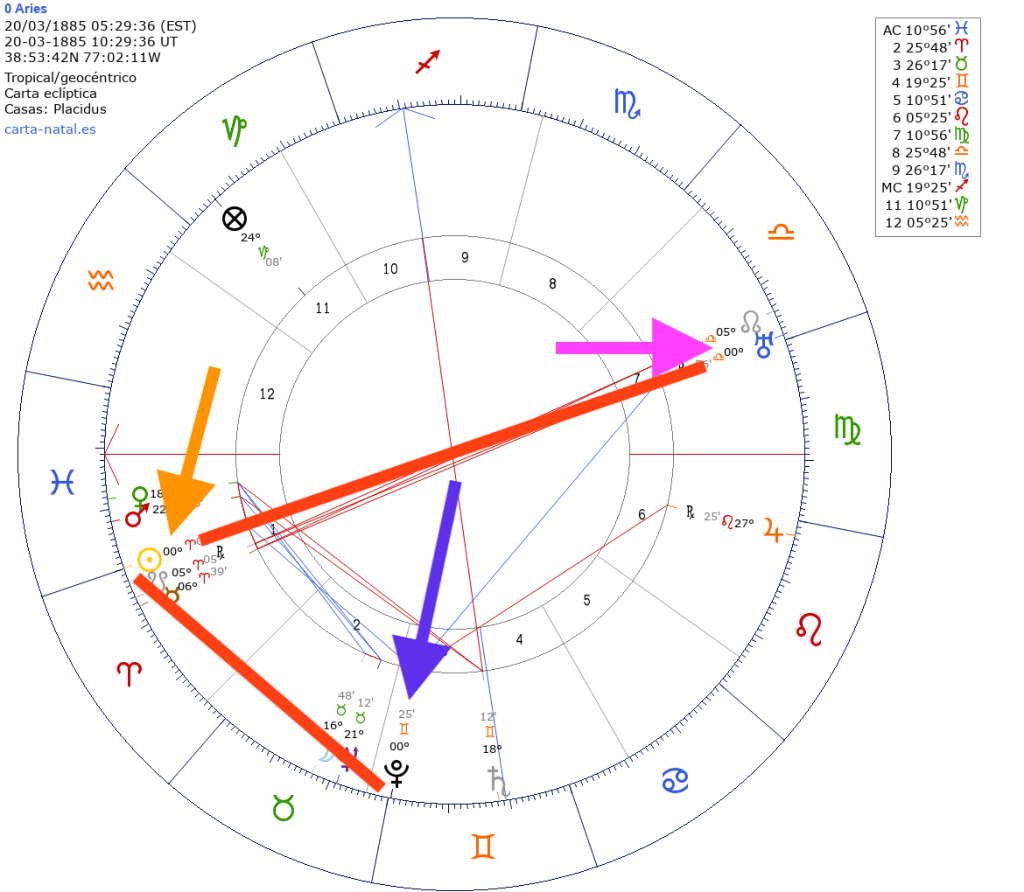 Los transpersonales en aspecto al sol, todos a la vez, son muy interesantes, porque en el paso de Plutón por géminis, en 1885 está al principio y en el siguiente mapa habrá evolucionado hacia al final de géminis, transformando la forma en la que nos movemos en los caminos (popularización del coche)