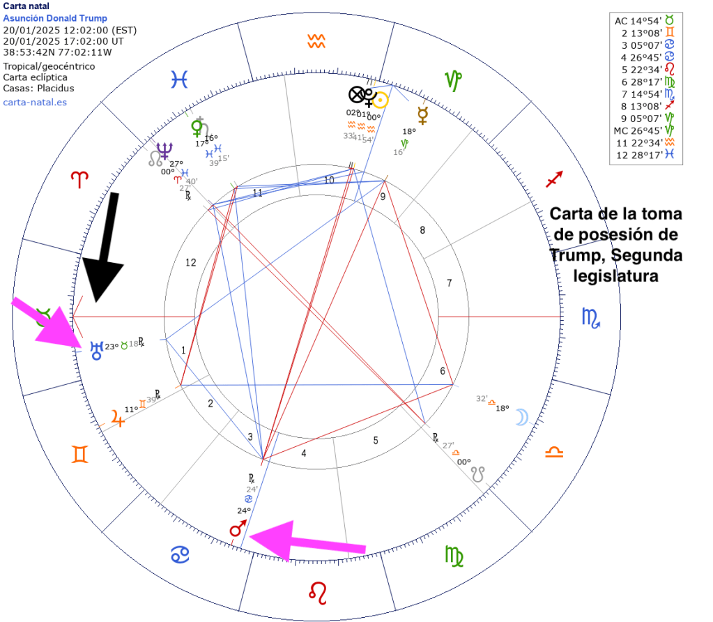 Bajo estas líneas, la carta de la toma de posesión de Trump, en Junio, Marte pasará sobre su Ascendente y después afectará a Urano en Tauro y Marte en cáncer.